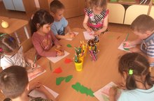 Дети, с помощью тафарета, учатся рисовать национальный орнамент.