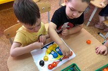 Икенче кечкенәләр төркеменең балалары йогурт капкачларын уенда актив кулланалар.