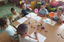 В рамках проекта "Мой веселый мячик" дети средней группы нарисовали цветные мячики при помощи надувных воздушных шариков. Воспитатель: Закирова Г.Н.