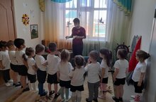 Кечкенәләр төркеме балалары белән Җиңүнең 77 еллыгына багышланган күргәзмә карау мизгеле.