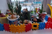 Дети старшей группы наблюдают за развитием луковиц, которые они посадили.