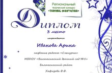 Иванова Арина "Кышкы фантазияләр" дип аталган Региональ иҗади конкурста 3 урын өчен диплом белән бүләкләнде. Эш исеме "Кар кызы"