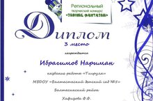 Ибраһимов Нариман "Кышкы фантазияләр" дип аталган Региональ иҗади конкурста 3 урын өчен Диплом белән бүләкләнде. Эш исеме "Тигруля".