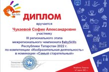 Воспитанница подготовительной группы Чукаева София, единственная участница из Балтасинского района, приняла участие на Республиканском этапе Межрегионального конкурса Baby Skills-2022 в номинации "Изобразительная деятельность". София выполнила достойно все испытания, практическое задание и защитила свой проект. Была отмечена в номинации - "Самый старательный"