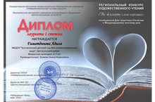 Дипломом лауреата 1 степени награждается Гиматдинова Адиля в Региональном конкурсе художественного чтения "Не жалейте слов хороших" посвященный Дню защитника Отечества и Международному женскому дню.