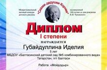К.И.Чуковский тууына 140 ел тулу уңаеннан "Корней бабай әкиятләре" Төбәкара читтән торып үткәрелгән рәсем конкурсында Гобайдуллина Иделия 1 дәрәҗәле диплом белән бүләкләнде. "Мойдодыр" эше. Педагог: Латыйпова Ләйлә Наилевна