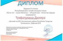 "Алтын хыял" билингваль балалар бакчасы "Татнетны үстерү фонды комерцияле булмаган оешмасы белән берлектә оештырган "Туган тел-халык байлыгы" - "Родной язык-богатство народа" республикакүләм онлайн шигырь укучылар бәйгесендә бакчабызның мәктәпкә әзерлек төркемендә тәрбияләнүче Тухфатуллина Диләрә, Мухаметшина Әдилә җиңү яуладылар. Афәрин.