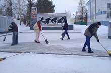 Волонтеры 10 класса облагораживли территорию памятника./10 нчы сыйныф укучылары һәйкәл территориясен кардан чистартты.
