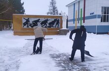 Обучающиеся волонтерского отряда очистили территорию памятника от снега/ Волонтер отряды укучылары һәйкәл территориясен кардан чистартты.