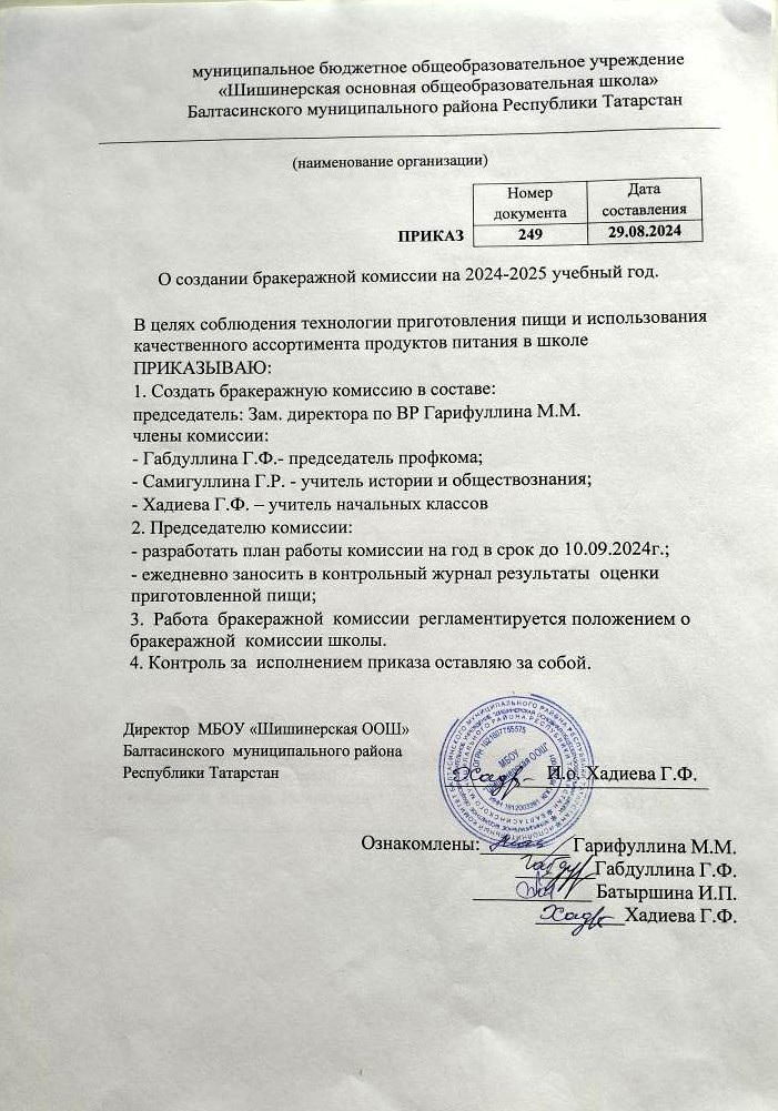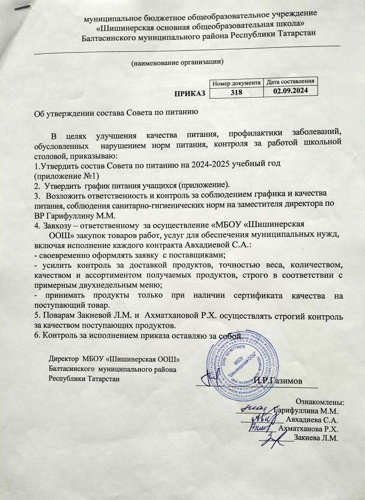 Приказ об утверждении состава Совета по питанию