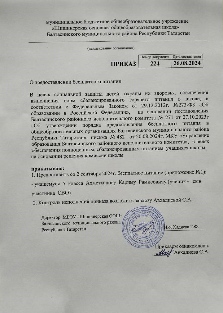 Приказ о предоставлении бесплатного питания