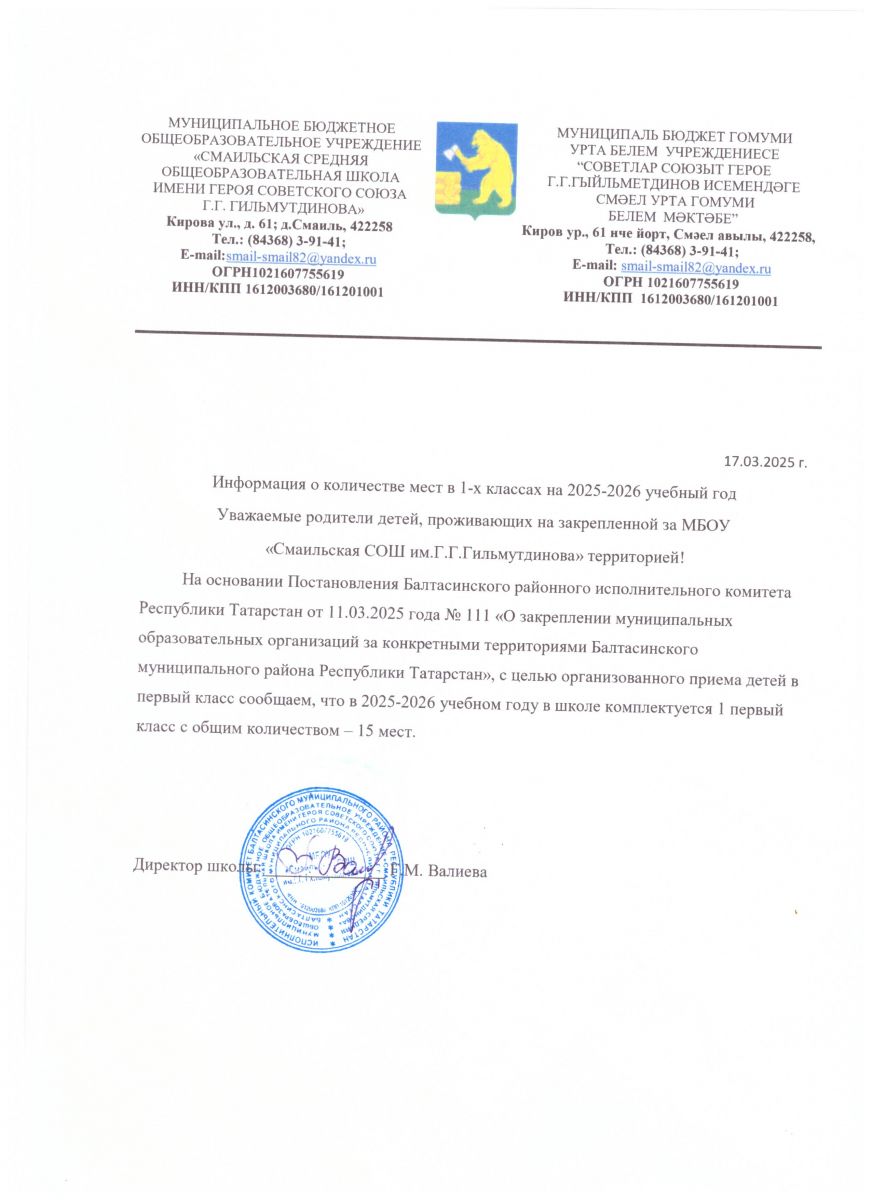1 апреля 2025 начинается кампания по Приему заявлений в первый класс МБОУ «Смаильская СОШ им. Г.Г. Гильмутдинова»для граждан, проживающих на закрепленной территории, а также детей, имеющих право преимущественного приема.