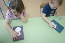 Аппликация "Снеговик" Закрепляем знания детей о круглой форме о различии предметов по величине. Учимся составлять изображение из частей, правильно их располагая по величине. Упражняем в аккуратном наклеивании.