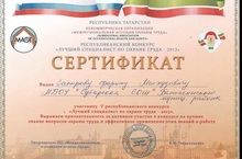 Закиров Фәрит Масхудович “Лучший специалист по охране труда -2013” V республика конкурсында катнашып сертификатка ия булды.