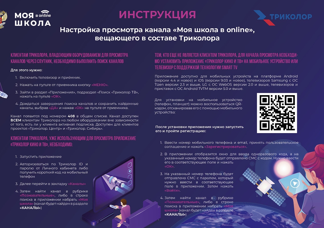 Уважаемые учащиеся, родители и педагоги!Триколор начинает трансляцию нового телевизионного образовательного проекта Минпросвещения России «МОЯ ШКОЛА в online». Что особенно важно сейчас.Занятия по общеобразовательным предметам для старшеклассников начнутся 22 апреля, на телеканале «Моя школа» мультиплатформенного оператора цифровой среды «Триколор».Подробная инструкция по подключению телеканала изображена на картинке! -