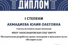 Мы поздравляем учителя истории и обществознания, руководителя музейной комнаты нашей школы Ахмадиеву Юлию Олеговну с успешным результатом в конкурсе профессионального мастерства "Музей как инновационное, современное образовательное пространство". Желаем дальнейших побед.
