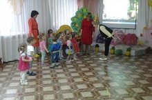 Первая младшая группа побывала в осеннем сказочном лесу, там они встретили ежика и гномика. Они вместе танцевали, пели песни, играли. Ежик и гномик подарили ребяткам волшебную тыкву, в котором лежали сладкие, румяные яблочки.