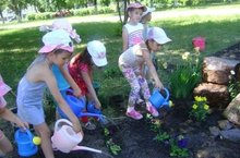 Оригинальный и красивый цветник из камней и цветов создали дети подготовительной группы вместе со взрослыми на аллее.