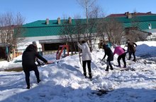 Сегодня коллектив детского сада дружно вышел на уборку территории от снега.