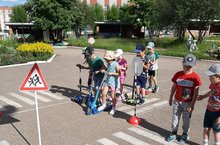 Сегодня с детьми старших групп на автоплощадке закрепили правила безопасного поведения на дорогах при езде на велосипедах и самокатах, повторили дорожные знаки.