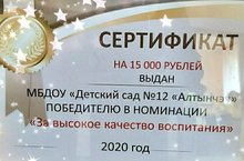 Коллектив МБДОУ "Детский сад №12 "Алтынчэч" удостоился сертификата за победу в номинации "За высокое качество воспитания" по итогам оценки эффективности деятельности дошкольных образовательных организаций Бавлинского муниципального района РТ за 2019-2020 учебный год. Благодарим весь коллектив за плодотворную работу, профессионализм. Поздравляем с заслуженной наградой!
