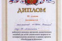 Коллектив детского сада удостоился Диплома за 3 место в районном конкурсе авторских дидактических пособий для детей дошкольного возраста по познавательному развитию в рамках проекта "Необычное в обычном"