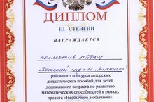 В районном конкурсе авторских дидактических пособий для детей дошкольного возраста по развитию математических способностей в рамках проекта "Необычное в обычном" коллектив детского сада удостоился Дипломом за 3 место. Поздравляем! Молодцы!