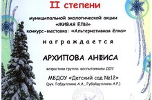 Поздравляем Архипову Анфису с победой "II место" в муниципальной экологической акции "Живая Ель" в номинации "Альтернативная ёлка" (средняя группа "Айболит", воспитатели - Габдуллина А.А., Губайдуллина А.Р.)
