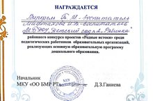 Педагог нашего детского сада удостоен первого места в районном конкурсе проектов “Родные истоки”. Воспитатель высшей квалификационной категории Вирфель Т.М и воспитатель первой категории Мифтахова И.В разработали и реализовали проект по изучению истории и культуры родного края. На конкурсе проект представила Татьяна Михайловна Вирфель, продемонстрировав видеофильм о нашем городе и нашем детском саде.