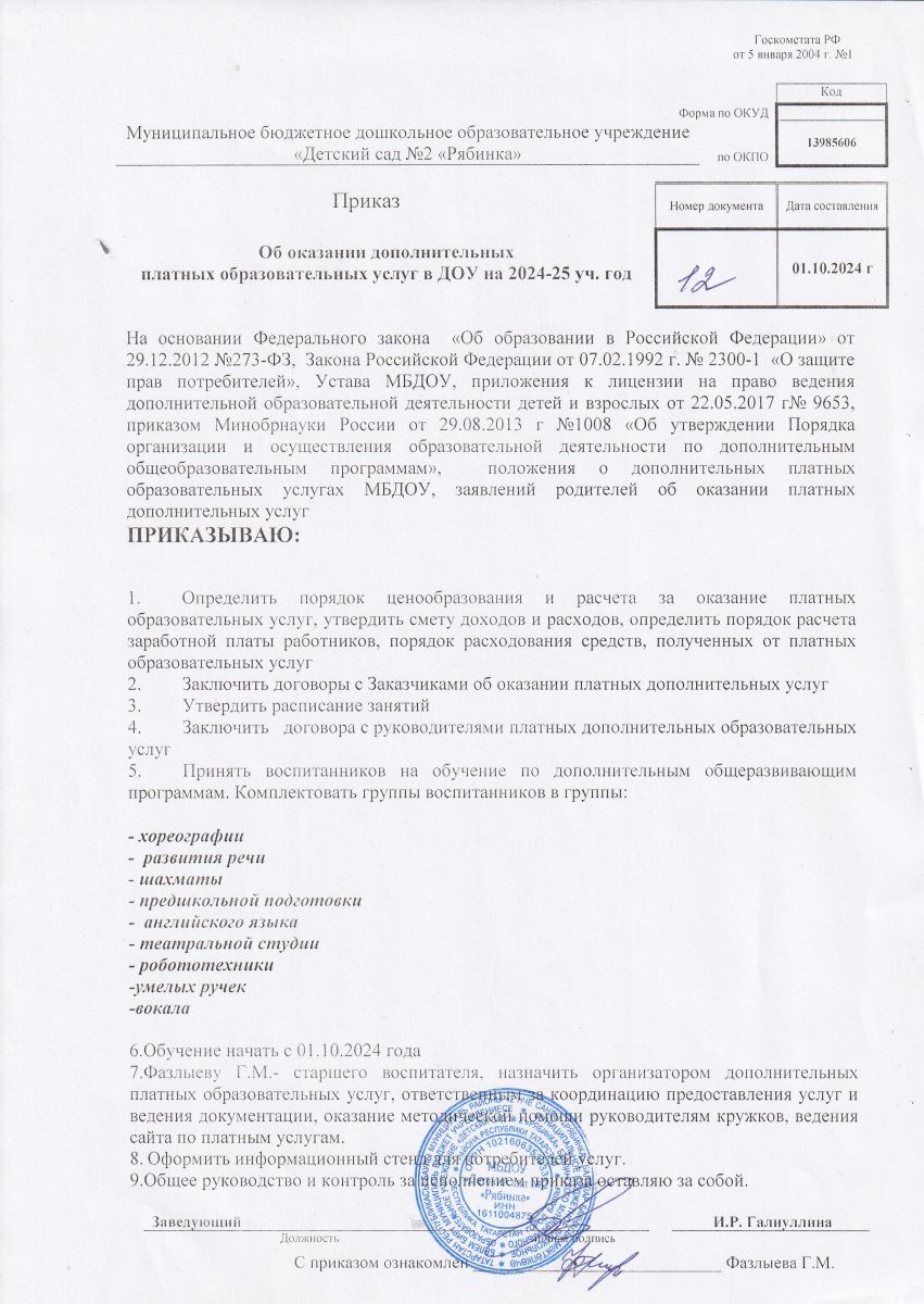 Приказ об оказании дополнительных услуг