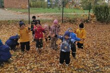 Көзнең матур чагын кечкенәләр төркеме балаларыда кызыгып күзәттеләр. Агачлардагы үзгәрешләр, төрле төстәге яфраклар турында аларга тәрбиячеләре сөйләде. Соңыннан балалар рәхәтләнеп яфраклар белән уйнадылар.
