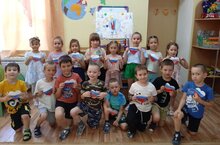 Бәйрәм уңаеннан балалар ябыштыру ысулын кулланып Рәсәй байрагы ясадылар.