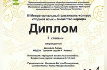 Мәктәпкә әзерлек төркемендә йөрүче Шакиров Артур “Туган тел-халык байлыгы” III төбәкара балалар иҗаты фестиваль конкурсында Фәнис Яруллин шигыренә язылган “Композитор чыпчыклар” җыры белән катнашып 1 урын алды.Котлыйбыз!