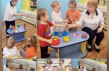 Во 2 младшей группе“Смородинка” тема “Посуда”. Дети с удовольствием послушали воспитателя, а потом с радостью пригласили ее на “чаепитие”. Все получили положительные эмоции.