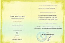 Өлкән тәрбияче Дәүләтова Альбина Рәшид кызы "Белем бирү оешмасы тьюторының һөнәри эшчәнлегендә цифрлы технологияләр"өстәмә һөнәри программасы буенча укулар узды. Әлеге программа Татарстан Мәгариф һәм фән министрлыгы заказы буенча республика педагогларын әзерләү кысаларында тормышка ашырыла.