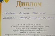 Подвели итоги муниципального этапа республиканского конкурса «Зелёный огонёк-2020» по профилактике детского дорожно-транспортного травматизма среди дошкольных образовательных учреждений. Наш педагогический коллектив занял 2 место. Поздравляем!!! Молодцы!
