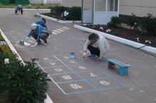 В детском саду идут работы по обнавлению и покраске разметок на асфальте.