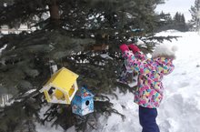 Снегири сидят на ветке,Канарейка поёт в клетке.Прилетели две синицы,Жёлто-бокие сестрицы.И сороки-белобоки,Стрекотать не устают.У окошка на пенёчке,Мы поставили кормушку,И зимой для малых пташек,Здесь застолье и уют.Салкын кыш айларында кошларга ризык табу бик кыенга туры килә. Без, балалар бакчасында тәрбияләнүче балалар , әти- әниләр ярдәме белән кошларга көчебездән килгәнчә ярдәм итәргә булдык - алар өчен җимлекләр ясадык. Җимлекләребез үзенчәлекле килеп чыкты. Без аларны бакчабыз тирәсендә үсеп утырган агачларга элдек. Балалар тәрбияче апалары белән берлектә һәр көн саен аларга җимнәр сибәләр, кошчыкларның чөкердәшә-чөкердәшә җим чүпләгәннәрен сокланып күзәтәләр. Кошларга ярдәм итә алуыбыз өчен без бик сөендек.
