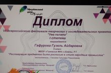 Диплом 1 степени VII Всероссийского фестиваля творческих и исследовательских проектов «Ума палата», Гафурова Гузель (учитель Ганиева Гульнара Рашитовна). «Акыл палатасы» VII Бөтенроссия иҗади һәм тикшеренү проектлары фестиваленең 1 дәрәҗә дипломы, Гафурова Гүзәл (укытучысы Ганиева Гөлнара Рәшит кызы). 13.05.2019