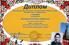 Диплом 1 степени республиканского конкурса, посвященного Г.Тукаю. Г. Тукайга багышланган республика конкурсының 1 дәрәҗә дипломы. 13.05.2019