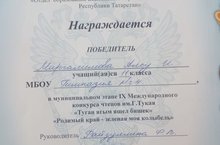 Поздравляем! Миргалиомва Алсу, ученица 11 класса гимназии - победитель муниципального этапа IX международного конкурса чтецов имени Г.Тукая «Туган ягым- яшел бишек» «Родимый край- зеленая моя колыбель». Котлыйбыз! Миргалиомва Алсу, гимназиянең 11 сыйныф укучысы - Г. Тукай исемендәге «Туган ягым-яшел бишек " IX Халыкара шигырь укучылар конкурсының муниципаль этабы җиңүчесе. 16.03.2019
