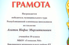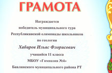 Котлыйбыз!!!Победитель муниципального тура Республиканской олимпиады школьников по геологии среди учащихся 11 классов. 30.03.2017