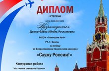 Поздравляем Давлетбаеву Айгуль!!!Диплом 1 степени! Всероссийский творческий конкурс "Служу, России!". 07.03.2017