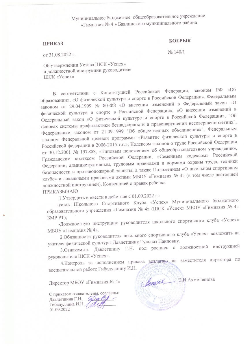 Приказ "Об утверждении Устава ШСК "Успех" и должностной инструкции руководителя ШСК "Успех"