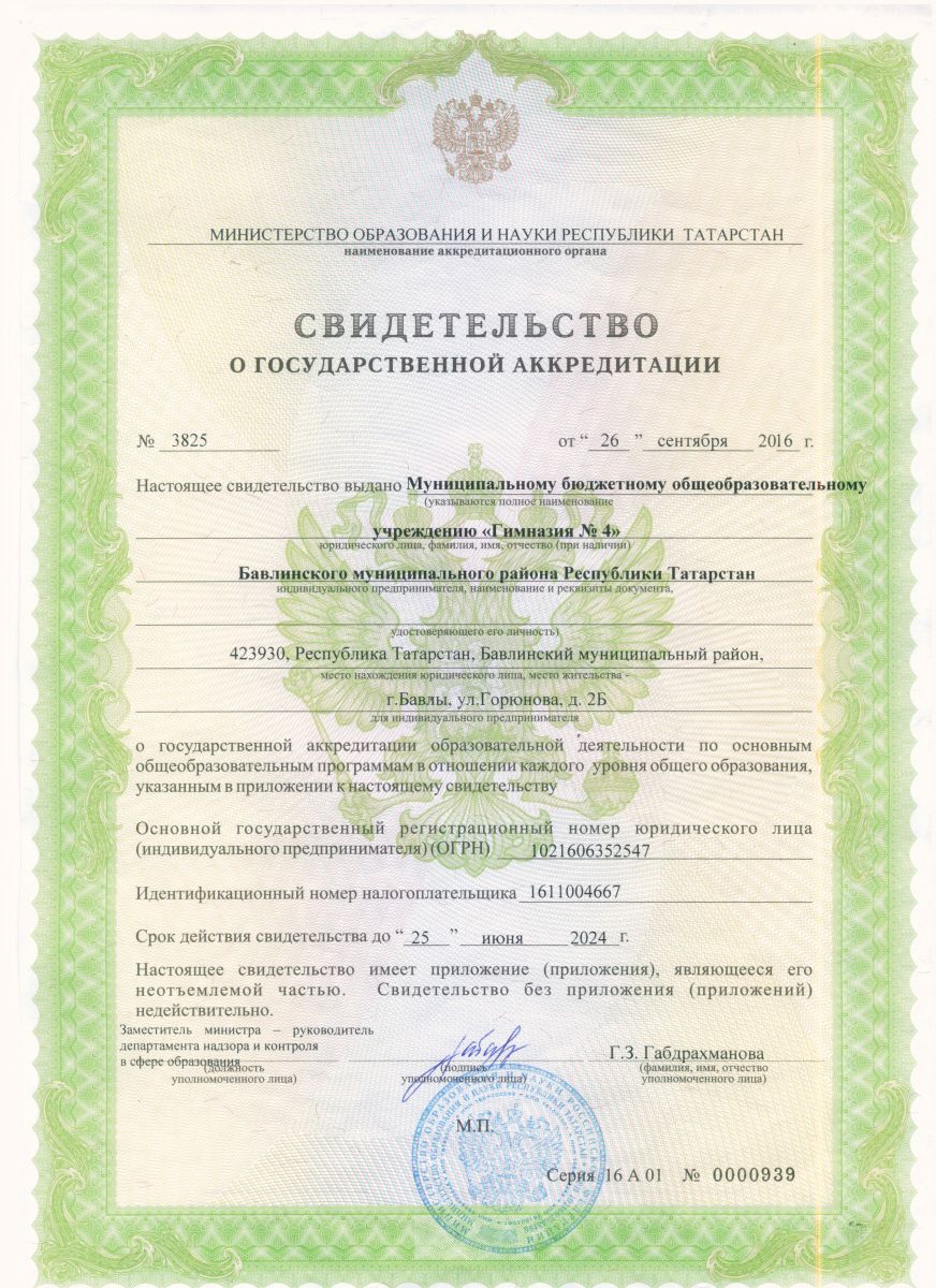 Муниципальное бюджетное общеобразовательное учреждение "Гимназия № 4" Бавлинского муниципального района РТ/Татарстан Республикасы Баулы муниципаль районының МБГБУ "4нче номерлы гимназия"