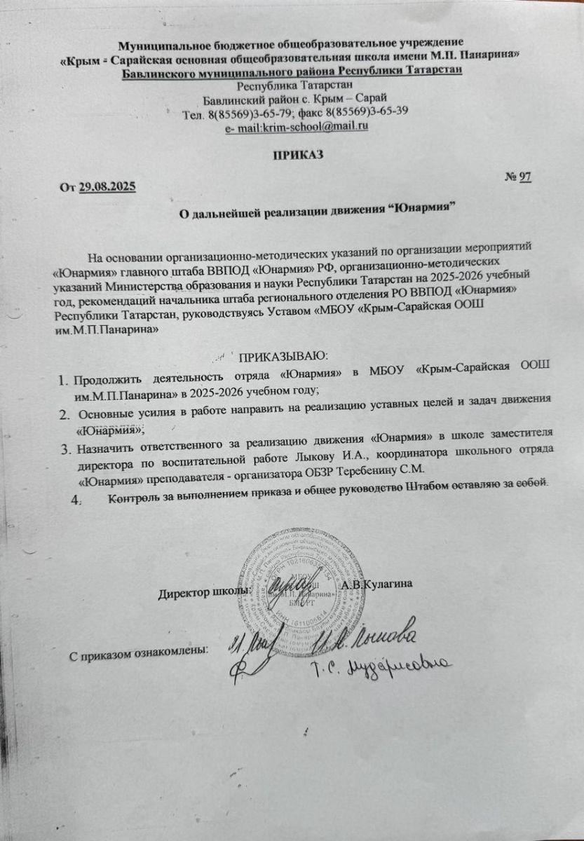 Приказ О дальнейшей реализации движения Юнармия