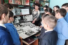 МӘКТӘП КИТАПХАНӘЧЕСЕ ИНЗИЛӘ НУРЛХАКОВНА УКУЧЫЛАРНЫ ГАБДУЛЛА ТУКАЙНЫҢ ТОРМЫШ ЮЛЫНА БАГЫШЛАНГАН КҮРГӘЗМӘ БЕЛӘН ТАНАШТЫРДА