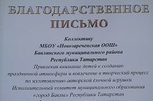 Благодарственное письмо от исполнительного комитета г.Бавлы за участие в конкурсе "Лучшая новогодняя игрушка"