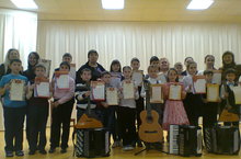 11 декабря состоялся общешкольный конкурс «Родные мелодии» на отделении народных инструментов. В нем приняли участие 22 ученика. Вступительное слово о роли музыки, о воспитании музыкального вкуса, о народных мелодиях как истоках национальной культуры сказала преподаватель Анна Ильинична Филимонова. На конкурсе исполнялись народные песенные и танцевальные мелодии- русские, татарские, башкирские, украинские, цыганские, кубинские - в простом изложении для самых маленьких артистов и в авторских обработках для ребят постарше. Дети играли на баяне, балалайке, аккордеоне, гитаре. В ожидании итогов конкурса музыканты не скучали - они сувлечением участвовали в викторине «Угадай мелодию», которую подготовила для них преподаватель Марина Александровна Епишкина.