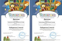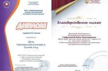 В номинации «Вокальное и музыкальное творчество» фортепианные дуэты Гаязова Карина и Мингалимова Гульнара, Газизуллина Элина и Хабибуллина Линара получили Дипломы Победителя (I место), а преподаватели – дипломы за подготовку победителей конкурса.